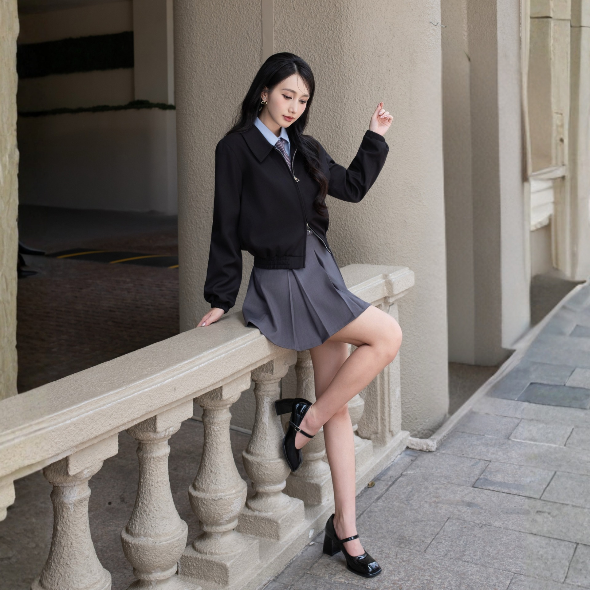 • Đường dọc: cà vạt mảnh + khóa zip = trục thẳng, outfit nhìn gọn